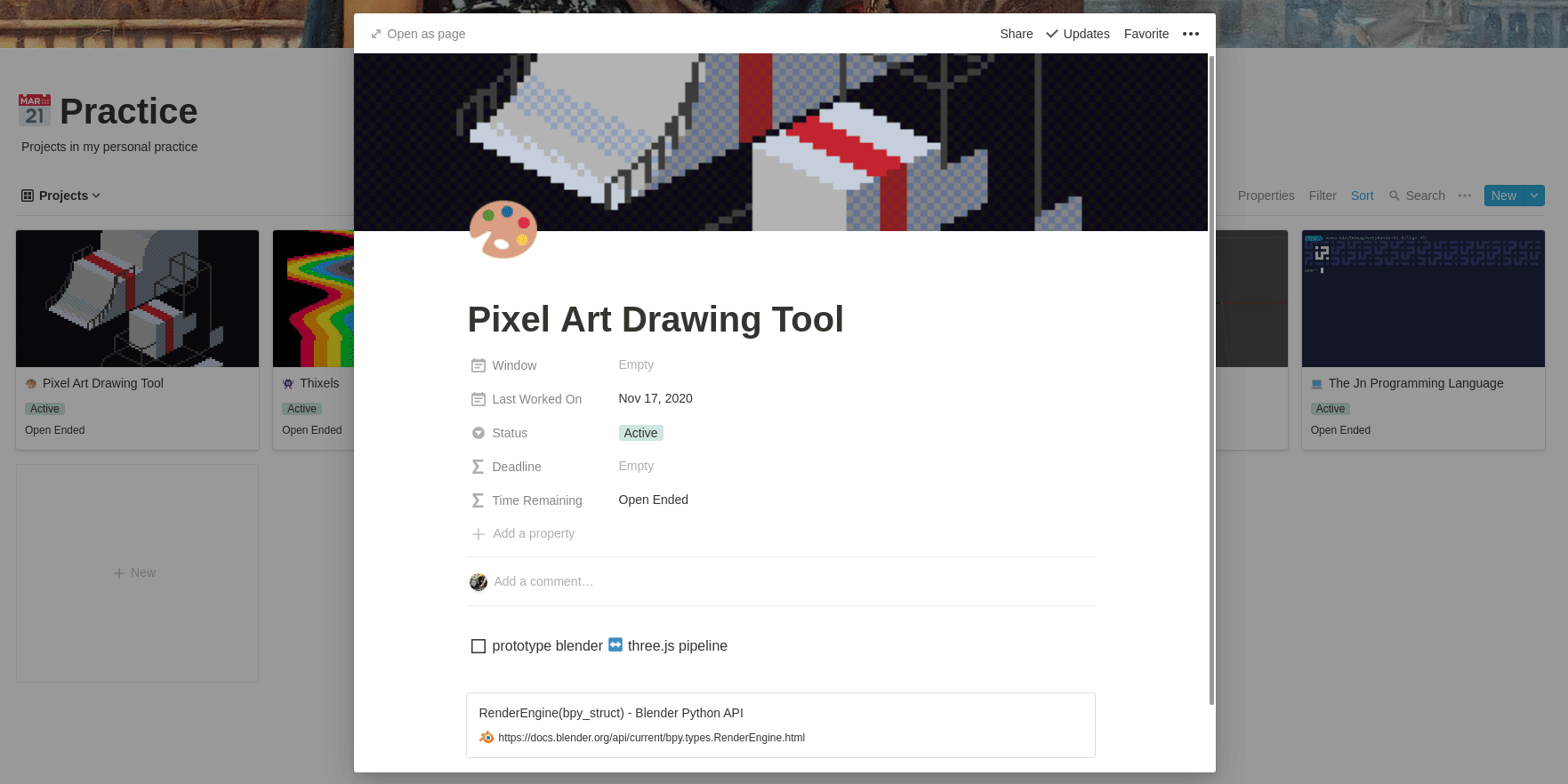 I use Notion to manage my practice these days, so I track every project in its own page. Project pages can have a lot of information — anything I need for the project, really, including references, notes, subpages, local todo lists, etc — but every page clearly spells out what I need to do when I next come back to the project. I also track the "Last Worked On" date as a property, so I can use Notion's sorted views to avoid manually reordering my projects. I update both at the end of a work session for the benefit of my future self. It is very satisfying to watch a project sink to the bottom of the list after working on it.